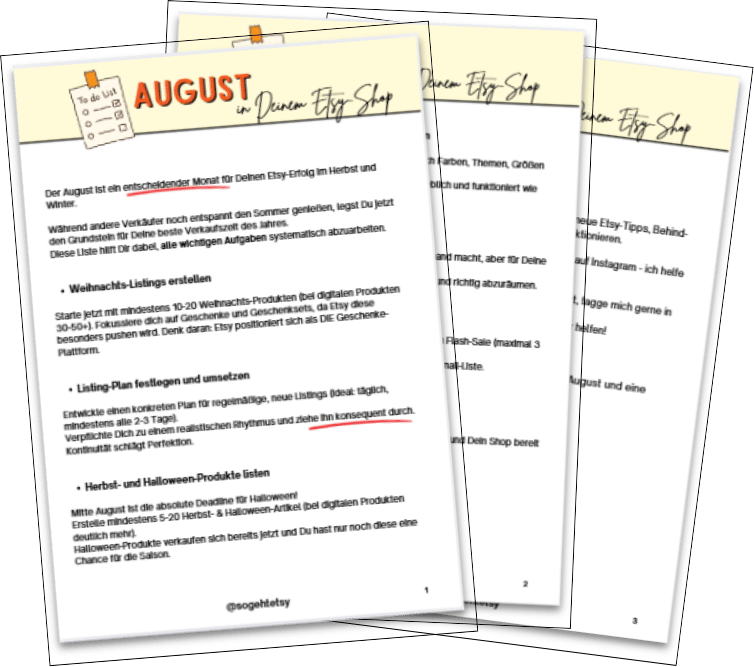 Du willst Dein Handmade-Business richtig ins Rollen bringen? Nebenbei oder sogar Vollzeit? Komm in meinen Newsletter, ich sende Dir wöchentlich konkrete Anleitungen und umsetzbare Tipps sowie gelegentlich auch "superschlaue Gedanken" von mir zu meinen Erfahrungen und Neuigkeiten auf Etsy. Alles, was Dich und Deinen Shop wachsen lässt. 🧡